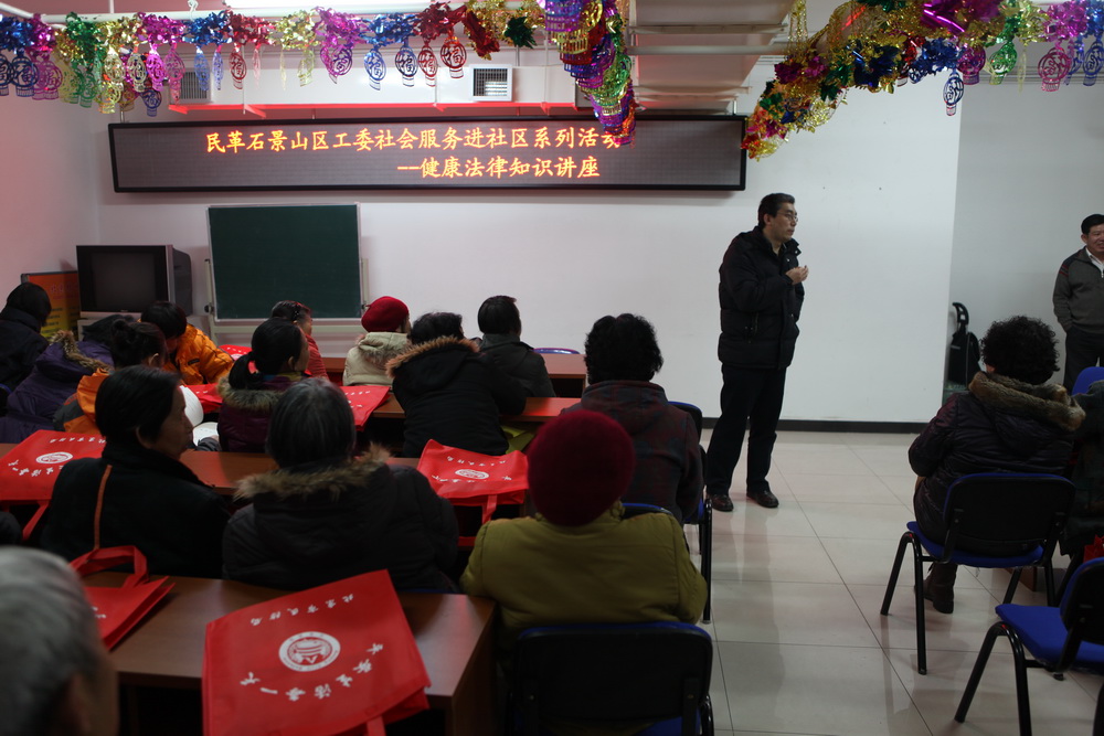2012年3月1日,民革石景山区工委社会服务专委会在西山枫林居委会举办了医疗法律服务进社区活动。区工委委员宁煜和陈光分别就医疗和法律问题讲课,获得了居民的欢迎。