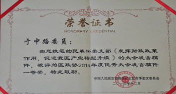 本报讯(贾大华)2014年12月22日-25日, 中国人民政治协商会议北京市怀柔区第四届委员会第四次会议隆重举行。区政协主席武占刚代表区政协第四届委员会常务委员会向大会作工作报告。 怀柔区政协常委、 民革怀柔支部主委于中路, 民革怀柔支部副主委、 区水务局副局长、 区政协委员魏自刚, 民革党员、 区政协委员于荣参加了本次会议。民革怀柔支部党员贾大华、 陈伟、崔云平、 郑代航受邀列席了开幕式、 委员发言以及闭幕式。 怀柔支部 《关于改善雁栖河上游以及北台上水库水质的建议》 获选2014年度优秀提案, 提案 《新形势下怀柔区养殖业结构调整的方向》 、 《发挥财政政策作用, 促进我区产业转型升级》 获得优秀奖和一等奖, 其中后者还作为怀柔支部的大会发言。 于中路与高旭明、 王桂英、 王金成、秦福荣、 郭怀静、 郭静、 肖海军撰写的《第100号关于政府加紧出台帮扶小微企业发展政策的建议》 个人提案获得优秀提案。于中路被评为2014年度优秀政协委员, 并因在喇叭沟门乡孙栅子村的献爱心活动中表现积极获得大会表彰。 |