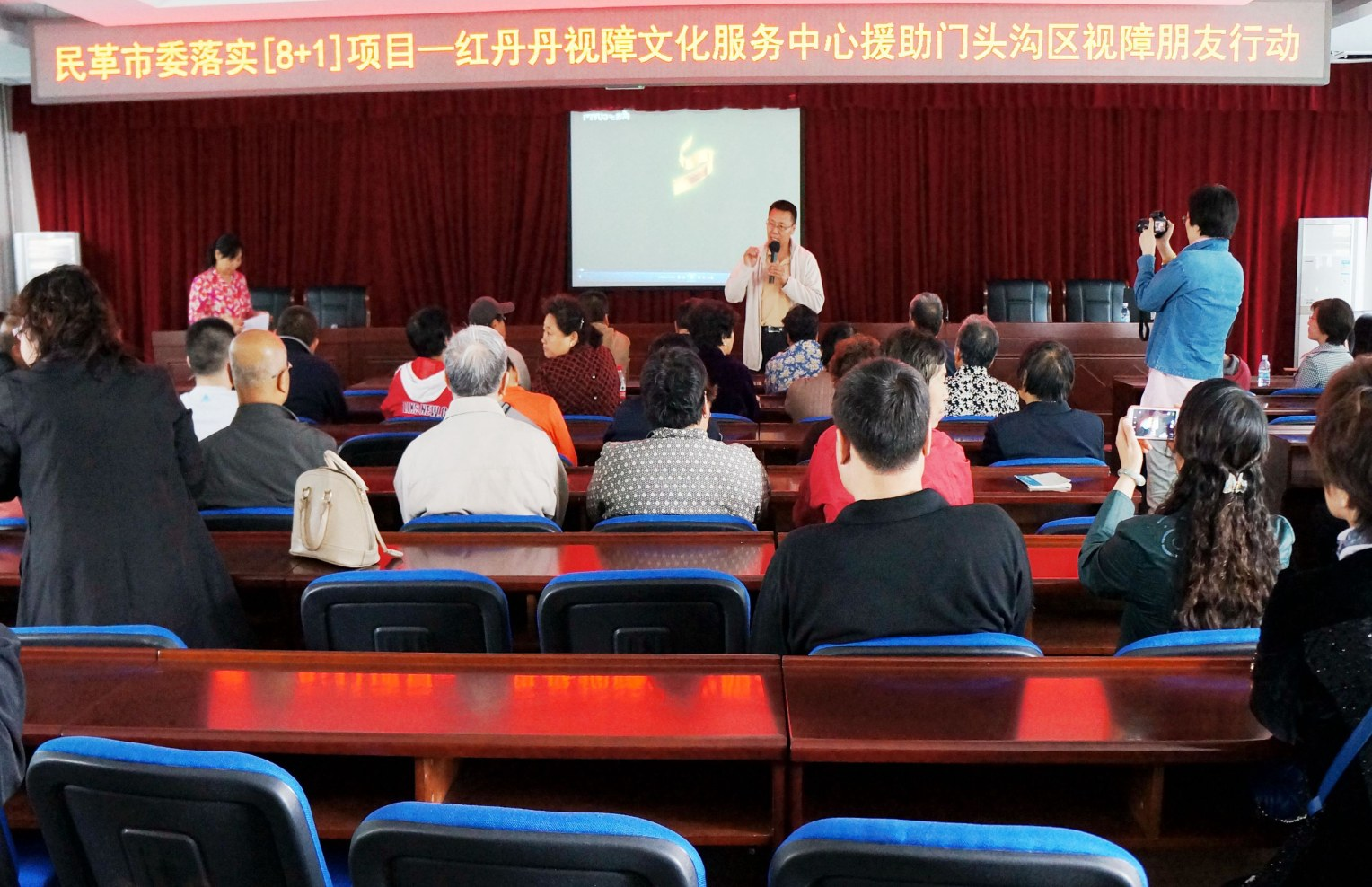 近日,民革市委与红丹丹视障文化服务中心联合为门头沟区的视障朋友带来一场精彩的听觉盛宴。由民革市委经社处与民革党员、红丹丹视障文化服务中心创始人郑晓洁等人牵头,率“讲电影”团队来到门头沟区残联礼堂,为该区近百位视障朋友讲述电影《甘南情歌》。这也是民革市委落实“8+1”项目的具体行动。图为红丹丹首席电影讲述人大伟老师正在为大家讲述《甘南情歌》。