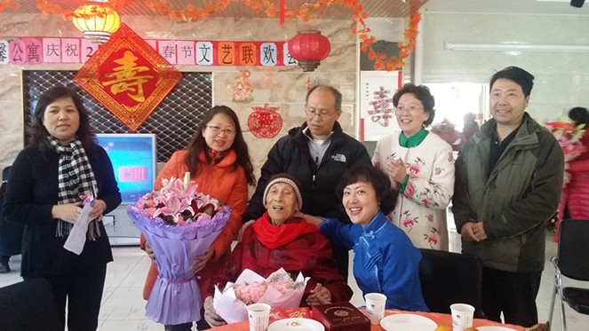 2016年1月17日,农历腊八节,添福增寿的好日子。雪后的昌平,气温很低,却阳光明媚。民革北京市委专职副主委褚玉梅、民革北大支部关平、昌平支部艾奇志等人分别代表各级组织为抗战老兵陈炎庆祝百岁寿辰。 陈炎为原飞虎队队员、北京大学教授、丝绸之路研究专家,译有《缅甸史》一书。老人在飞虎队电台工作3年间,配合飞虎队参加了昆明空战、保卫仰光空战、保卫滇缅公路站等多次重要战役,被誉为“飞虎队灵敏的耳朵”。 1916年出生的陈炎教授如今已过百岁。1月17日上午,褚玉梅、关平、艾奇志一行人前往昌平十三陵温馨老年公寓为老人庆祝百岁寿辰,并分别为老人致上贺词,祝老人福如东海、寿比南山。席间大家为老人准备了生日蛋糕及丰富的寿礼,一起为老人唱生日歌,与老人聊天,陪老人度过了一个温馨愉快的百岁生日。陈炎老人随着生日快乐歌的优美旋律许愿、吹蜡烛。温馨老年公寓里一片祥和欢乐! 老人表示百岁生日过得特别开心,并同子女一起对此次来访的褚玉梅等一行人表示由衷的感谢。
