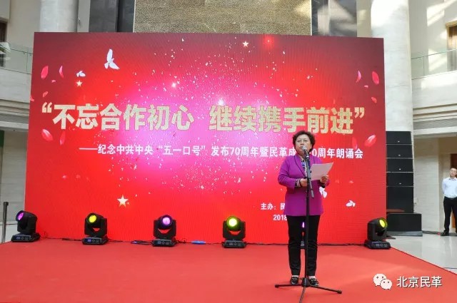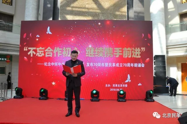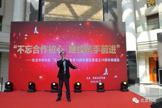 4月25日,民革北京市委举办“不忘合作初心,继续携手前进”——纪念中共中央发布“五一口号”70周年暨民革成立70周年朗诵会。全国政协常委、民革中央副主席、北京市副市长、民革市委主委王红,民革市委专职副主委褚玉梅出席活动。应邀出席活动的还有团结出版社副社长赵广宁,以及民革中央宣传部、团结报社、中共北京市委统战部的有关同志。民革市委常委、委员、各区级组织负责人及党员代表、民革市委机关干部等近300人参加了此次活动。 王红在致辞中说:70年前,中共中央发布 “五一口号”,为中国共产党领导的多党合作和政治协商制度的形成和建立奠定了重要的政治基础,是我国多党合作制度发展史上具有里程碑意义的重要历史事件。70年前,民革中央发表《响应“五一”号召的声明》,响应中共“五一”口号、参加新政协运动、确认中国共产党的领导地位,是民革史上的一个重大转折,是民革顺应历史潮流的必然选择,是民革继承和发扬孙中山爱国革命不断进步精神的重要体现。自觉接受中国共产党领导,是民革光荣传统的核心,是民革立党之本。 70年来,正是得益于新型政党制度的优越性,中国共产党团结带领包括各民主党派、无党派人士在内的全国各族人民勠力同心、接续奋斗,使中华民族迎来了从站起来、富起来到强起来的伟大飞跃。 70年来,正是得益于新型政党制度的优越性,民革自身也得到了健康发展,面貌焕然一新。目前,全国共有民革党员13万人,30个省级组织,民革市委已经拥有近6000名党员。他们分布全市在各个领域,不仅在本职工作中发挥着积极作用,也为首都发展贡献了智慧和力量。 今天,我们以朗诵会形式重温“五一口号”,就是要学习贯彻习近平新时代中国特色社会主义思想和中共十九大精神,始终不渝地坚持中国共产党的领导,始终在思想上政治上行动上同以习近平同志为核心的中共中央保持高度一致,不断增强制度自信,切实提高履职水平,共同坚持好、发展好、完善好中国共产党领导的多党合作和政治协商制度,在新时代展现多党合作的新气象新作为。 邹一正《自由、奋斗、救中国》 刘燕、孙书文《最快乐的一天》 艾莉《我为“五一口号”放声歌唱》 王广营《“五一口号”感怀》 张启惠、何小威《不忘初心》 陈揆《假如我能穿越时空》 李筱松、葛楠、李世峰 《继承民革传统 不忘合作初心》 王茜 文雯 燕镜伊 李京 赵广宇 王耀谦 李子聪 《不能忘却的初心》 邰超《沁园春·雪》 杨淑红《两岸的春天》 王彤彤《初心犹未改 携手话征程》 高琦《乡愁》 齐欢《倾听中国故事 感悟中国智慧》 何洋《启盼团圆》 徐晓栋《祖国啊,我亲爱的祖国》 王淑娟、陈明《风雨同舟 共创伟业》 黄帝《我的祖国》 伴随着柔美的音乐,一首气势磅礴、富含深情的集体朗诵诗歌——《庄严的选择》为朗诵会拉开了帷幕。本次朗诵会从全市党员里面的朗诵爱好者中精选了17个节目依次登台亮相。选手们一个个正装上台,或激昂,或柔缓,或急促,或随和,一段段激情飞扬的词句感染了在座的每个人。有的诠释了对祖国、对民革的热爱;有的深情款款的回忆起多党合作之路的光荣历史,民革的光荣历史;有的以情景再现的形式表达了对民革历史伟人的无限怀念;有的满怀激情地述说着对祖国美好未来的祝福。最后,全体朗诵者登台共唱《我和我的祖国》,将活动推向高潮,表达了民革党员对祖国明天无限美好的期待。 |