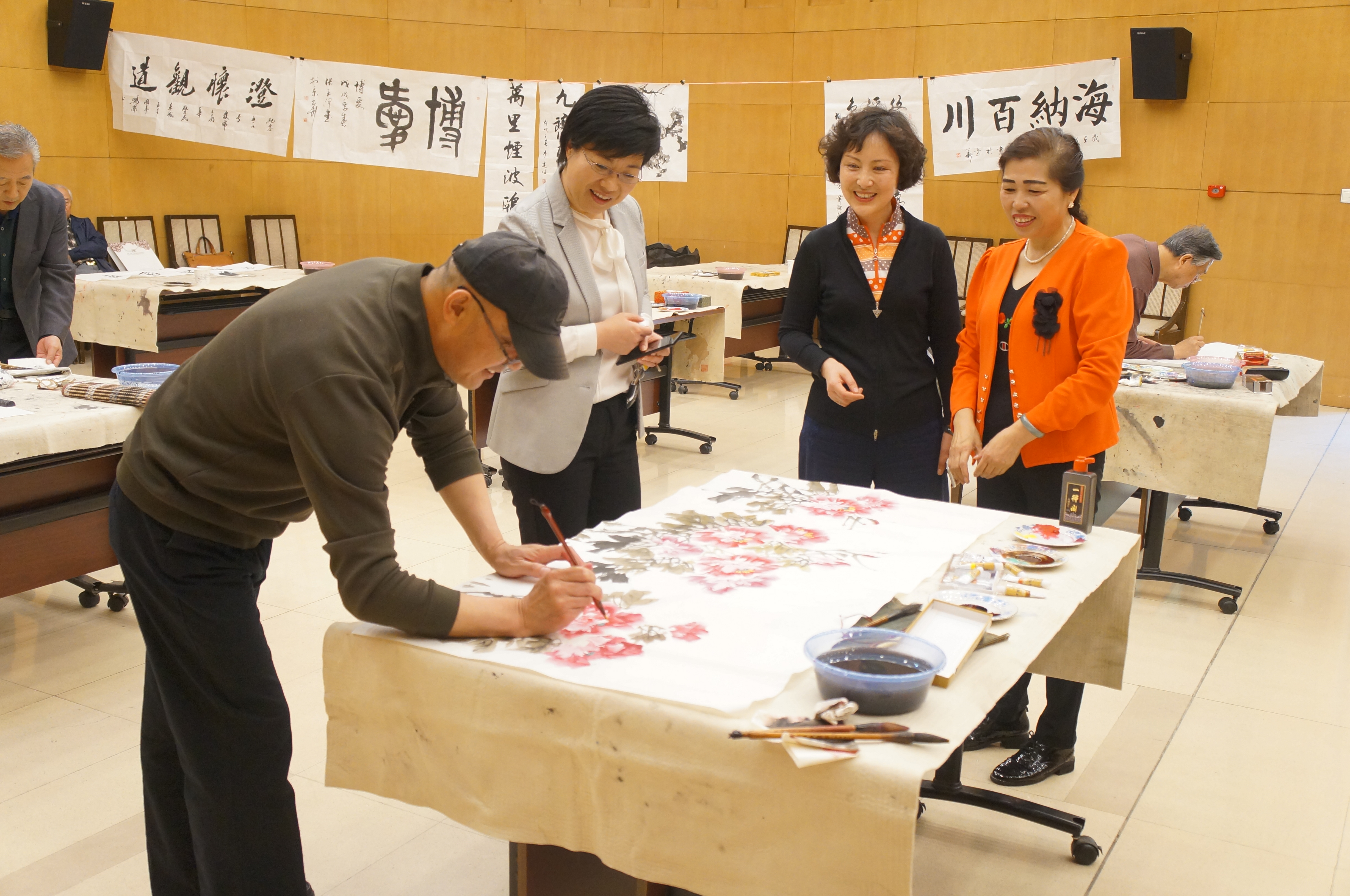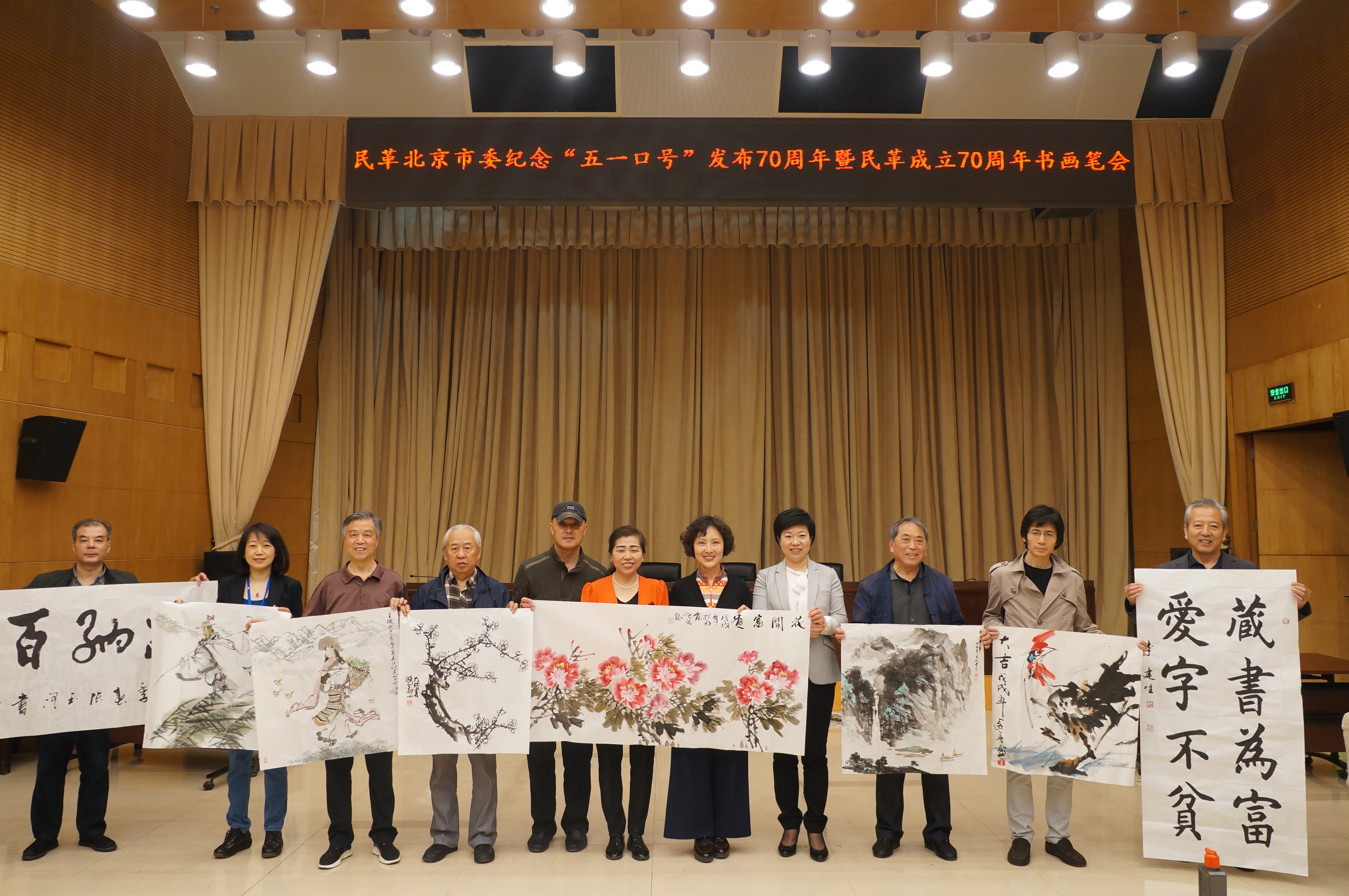 4月26日,民革北京市委纪念中共中央发布“五一口号”70周年暨民革成立70周年书画笔会在民主党派大楼一层多功能厅举行。民革北京市委专职副主委褚玉梅、王英出席活动。 王英在笔会开始前发表讲话,表示今年中国共产党发布“五一口号”70周年,也是民革成立70周年。70年前,中国共产党为动员全国各阶层人民实现建立新中国的光荣使命,发布了纪念“五一”劳动节口号,得到了民主党派、无党派民主人士的热烈响应,他们发表宣言、通电和谈话,并接受邀请奔赴解放区,与中国共产党共商建国大计。这是我国统一战线和多党合作发展史上一件具有里程碑意义的事件,标志着各民主党派和无党派人士公开、自觉地接受了中国共产党的领导,标志着各民主党派和无党派人士坚定地走上了新民主主义、社会主义的道路,标志着中国的民主政治建设和政党制度建设揭开了新的一页。各民主党派和无党派人士从此同共产党团结合作,建立起一个独立、民主、和平、统一的新中国。今天也是第18个世界知识产权日,书画创作是艺术家智慧与心血的结晶,希望北京中山书画社继续坚定文化自信,围绕纪念这个重大历史事件为主题,创作出无愧于我们这个伟大时代和祖国的书画艺术精品。 书画笔会以“不忘合作初心,继续携手前进”为主题,邀请北京中山书画社副社长赵鸿月、张骏、纪远英等10位艺术家挥毫泼墨,回忆民革与中共合作的光辉历史,表达民革拥护中国共产党领导和热爱多党合作事业的心声。书画笔会共创作以《海纳百川》为代表作的33幅书画作品。 |