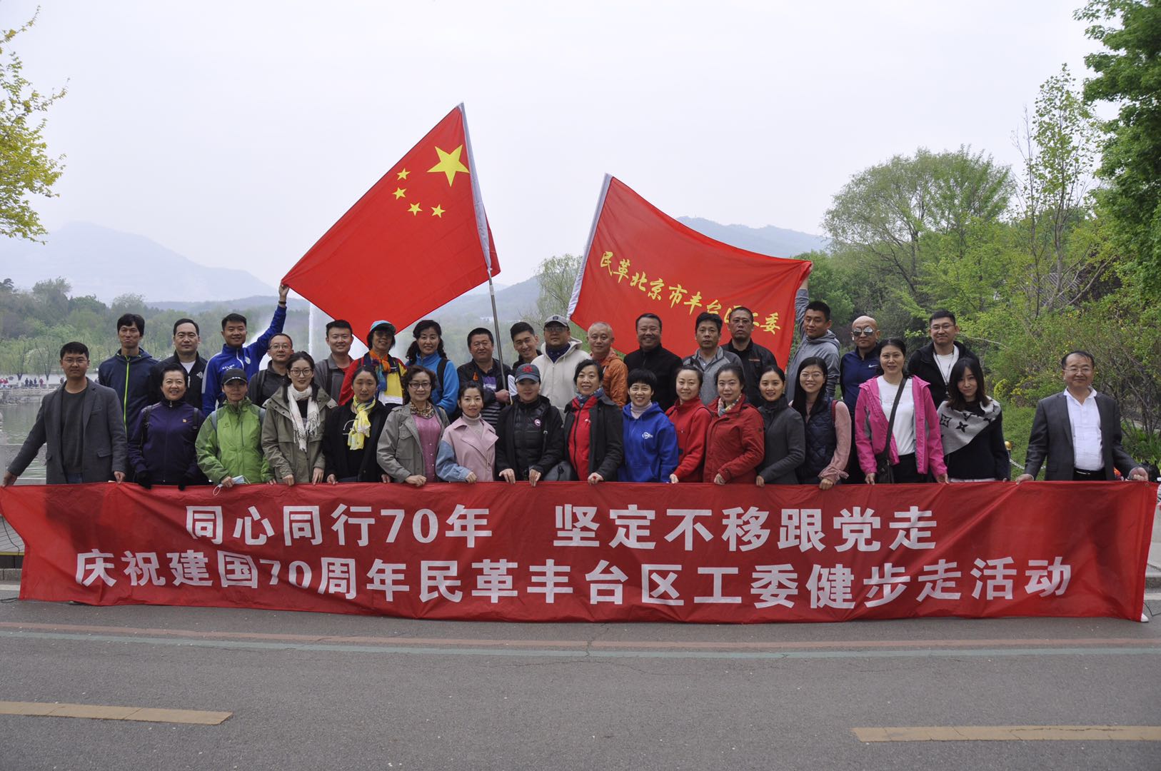4月27日,民革丰台区工委为落实“首都统一战线庆祝新中国成立70周年”主题教育活动,按照民革市委主委王红代表各民主党派提出的“要放声歌唱祖国,让五星红旗永远飘荡在我们心中”等四点倡议要求。民革丰台区工委在北宫国家森林公园组织了“同心同行七十年 坚定不移跟党走”庆祝建国70周年青年党员健步走活动。近40名年轻党员参加活动。