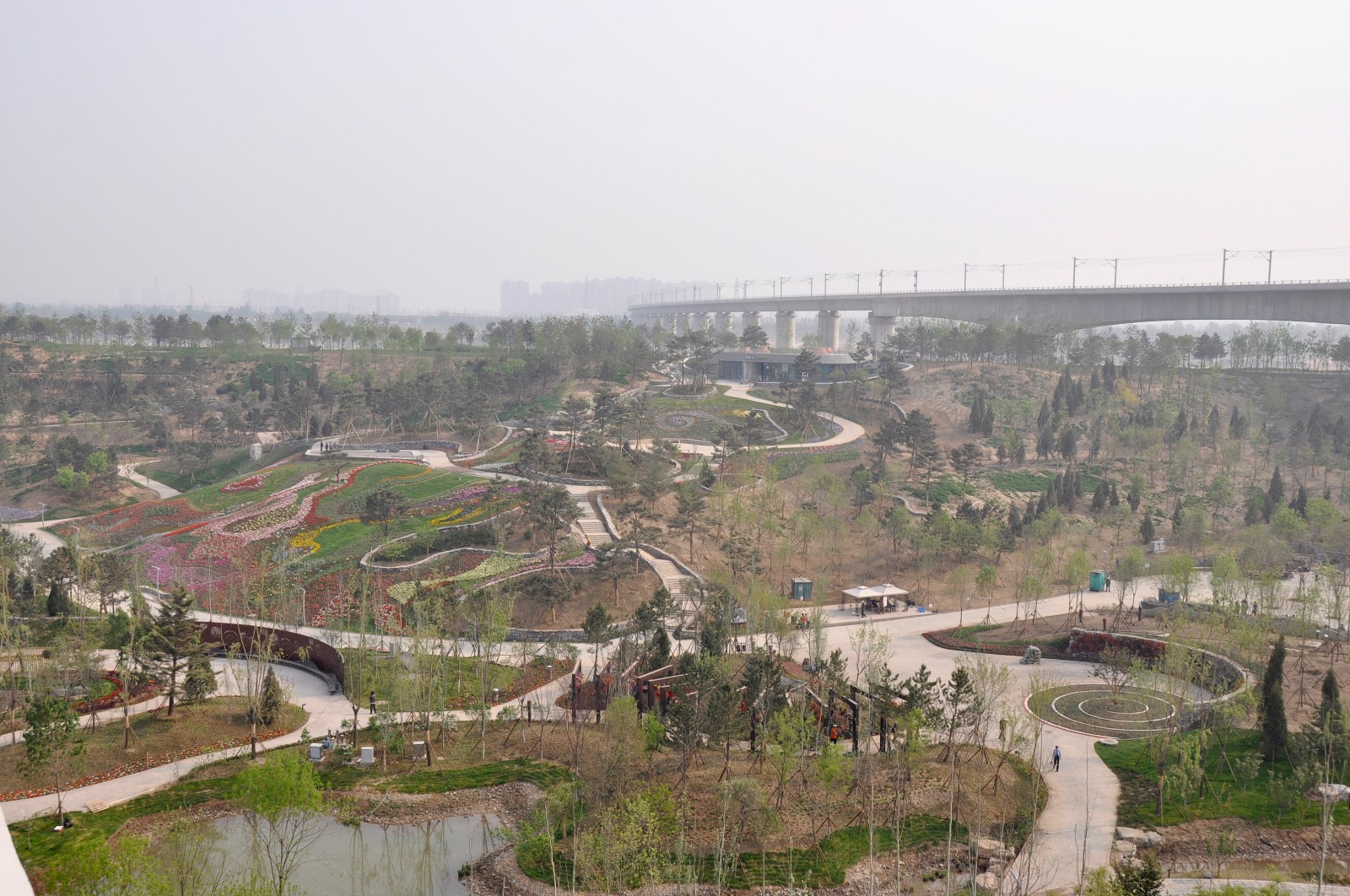 北京园博园锦绣谷原为永定河河床的一部分,曾作为采砂场,后成为建筑垃圾填埋场。设计师利用既有地形,将现状垃圾填埋场改造为下沉式景观花园,取传统的“燕京八景”之精髓,内设有燕台大观、风篁清听、云台叠翠、云飞霞起、绿屿花洲、林天霞影、采芳云径等景区和大型山石叠水、花卉瀑布等景观,成为北京园博会生态修复的新亮点,如今的园博园已今非昔比。