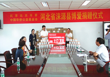 8月4日,民革北京市委携手中国华侨公益基金会在河北省涞源县举行博爱捐赠仪式,北京市政协委员、民革北京市委秘书长蒋耘晨,中国侨联干部培训中心处长寿长华,民革北京市委经社处处长常桂云,涞源县委常委、副县长梁永强,涞源县民政局局长薛强等领导参加了捐赠仪式。 捐赠仪式上,蒋耘晨带来了民革中央和民革北京市委领导对7月暴雨受灾群众的关心和慰问,由民革北京市委携手中国华侨公益基金会向涞源县捐赠由上海菲雅进出口贸易有限公司提供进口食品15000罐,市场价值人民币117万元,帮助受灾群众解决实际生活困难。民革北京市委携手中国扶贫开发协会宣教委员会,由北京市民革党员王璐林捐助4万元,用于涞源县白石山村20亩马铃薯示范种植农资支出和补贴。同时,北京民革党员企业家还带来“油莎豆种植产销”和“爱心资助贫困学生”两个优质项目,进一步助推涞源县精准扶贫攻坚工作。 此次捐赠活动是民革北京市委学习贯彻落实习近平总书记“七一”重要讲话精神,不忘初心,坚持共产党的领导,发挥民革优势特点推进京津冀协同发展的重要体现。涞源县民政局局长薛强、白石山镇副镇长李建华代表接受捐赠并表示感谢。涞源县委常委、副县长梁永强说,今年4月以来民革组织在涞源县做了景区救助站援建、马铃薯种植、职业教育等一系列有效的精准扶贫项目,民革北京市委再次到涞源进行博爱捐助活动,为涞源县精准扶贫攻坚工作鼓舞了士气和增添了信心。