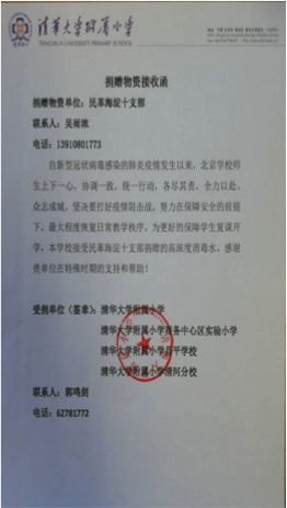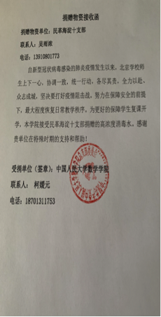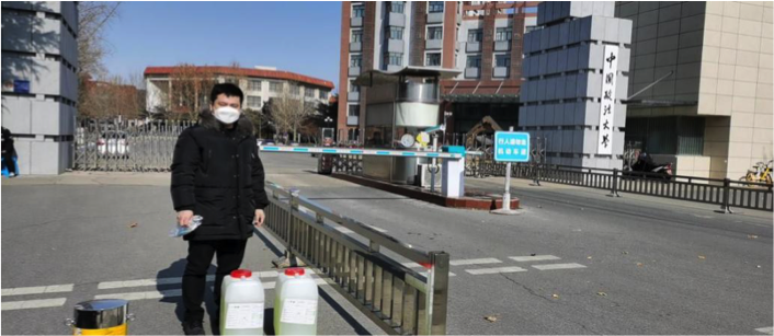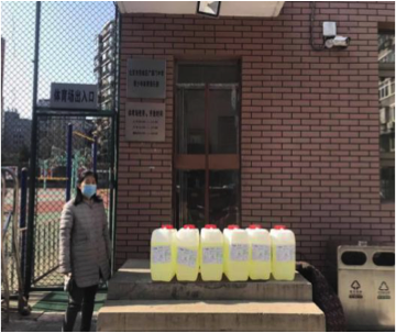 民革海淀区工委第十支部的党员们一直关注着这个重大的社会问题,组建了以党员吴雨浓、马靖昊为组长的为北京学校抗疫募捐小组。吴雨浓精心策划捐赠方案,并落实学校联络、物资运送等方面工作;马靖昊经多方联系沟通,克服了防控物资管控的困难和障碍,迅速落实了100桶重达2500千克的消毒液物资。