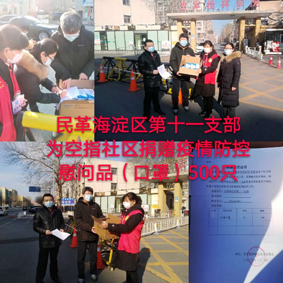 疫情以来,海淀十一支有4名党员在平凡的岗位上,一直坚守各自负责的社区。北三环中路40号院社区,支部党员陈洁担任中共支部书记兼居委会主任,她负责的社区零病例,每天24小时坚守在岗位上,白天处理各种事务,夜晚在社区门口执勤站岗。尤其在周边相邻社区出现了确诊病例后,进一步加强防控措施,带领居委会的全体员工把防控工作做的更细更实,截止目前该社区没有出现任何异常,得到了海淀区委于军书记的表扬。国税海淀税务所副所长,支部委员陈璋既要完成为企业税务网上申报辅导工作,又要下沉社区轮流值守。北太平庄街道干部,支部党员王彦负责在明光北里社区值守。社区工作人员、年轻党员刘衍俊在东升镇马坊社区值守。 受海淀区统战部安排,十一支部负责与曙光街道空军指挥学院社区对口支持,联防联控,共克时艰。随着返京人员不断增多,以及雨雪天气条件下,支部了解到疫情联防联控第一线的基层工作者的工作压力越来越大,防疫口罩面临严重短缺。